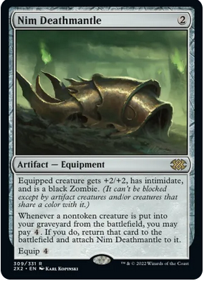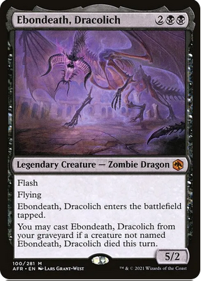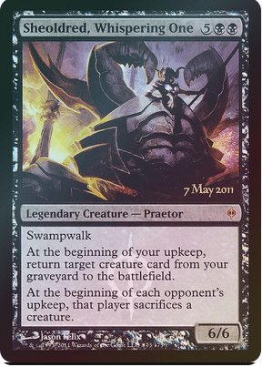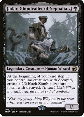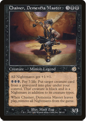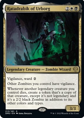 Este gracioso zombie hechicero es un 3/3 con vigilancia, ward 2 y que da vigilancia a todos los zombies que controlemos. Sin embargo, lo que le hace más atractivo es su segunda habilidad: cuando una criatura legendaria nuestra muera, crearemos un Zombie negro token 2/2 que sea copia de esa criatura salvo que no será legendaria.