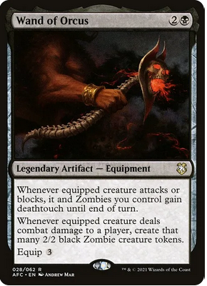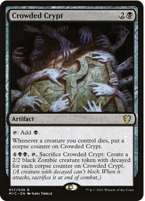 Primero tiramos un poco de reanimator, donde el altar de Bhaal exiliando un token nos trae a un amigo de vuelta, el nim deathmantle aparte de ganar intimidar aprovecha la vigilancia de rata y si algo muere, por 4 reanimamos. La crowded aparte de piedra de maná, puede valernos como finisher sacando muchísimos zombies del sombrero y la varita de orcus tiene sinergia con casi todo el deck.