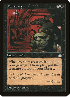 Mención especial al mortuary donde de nuevo a coste cero conseguimos que cuando una criatura nuestra muera vaya al top en vez de al cementerio, generándonos muchísimo value.
