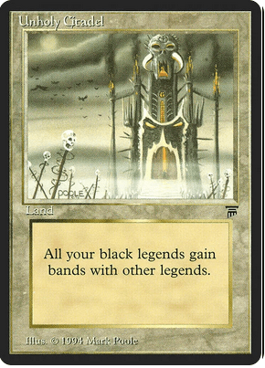 Y aqui viene mi particularidad en este deck. Traigo la Cathedral of Serra y la Unholy Citadel (de Legends en italiano no llegan al euro cada una). Cuando las juguéis y useis banding para atacar o defender, vuestros rivales se van a quedar con el culo torcido… y probablemente vosotros también xD. Pero para defender poder elegir el orden de las cartas del grupo de bloqueadores es algo demasiado importante aunque se valore poco.