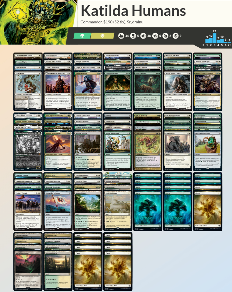 Si tuviera que explicar en pocas palabras el mazo, sería como el típico Commander monoverde de elfos, pero en versión humanos.