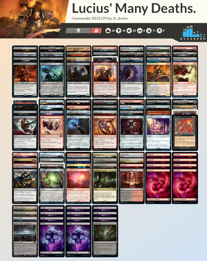 La sinergia principal de Lucius será la de eliminar la mesa de amenazas, ya que lo sacrificarnos para matar criaturas ajenas. Al sacrificarlo para pagar el coste del hechizo, saltará su habilidad y elegiremos a la criatura que vamos a matar con el hechizo, así Lucius habrá muerto y resucitado al mismo tiempo que hemos eliminado una criatura del oponente.