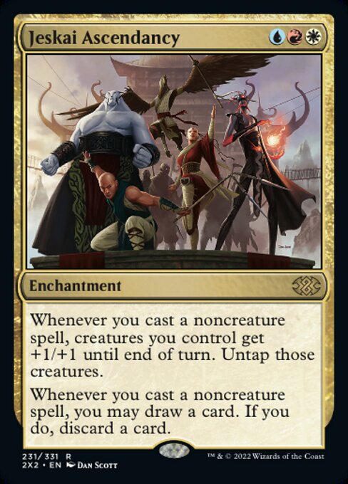 Los encantamientos son pocos pero muy sinérgicos con el deck. La maravillosa rémora mística hará que robemos muchas cartas, sobretodo al principio de la partida. La fundación del Tercer Camino es obligada y encaja muy bien en el deck igualmente. La ascendencia jeskai hara que enderezcamos nuestras criaturas al lanzar un hechizo, con lo que si esta la Archimandrita podremos robar cartas adicionales al volver a girar a las criaturas. Las palabras nos darán vidas a cambio de robo de cartas para poder dar sorpresas en el turno del rival. El torbellino nos dará robo adicional con el 50% de nuestras cartas. La convicción verdadera será casi un finisher cuando tengamos varias criaturas en mesa con la Archimandrita gracias a que el primer ataque doblara la fuerza del segundo ataque.