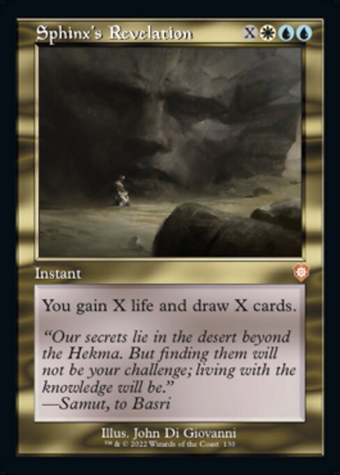 El resto de Conjuros nos hará devolver todos los permanentes a las manos. La revelación de la esfinge casa muy bien con la filosofia del deck de ganar cartas y vidas. Con el sacramento para darnos un festín de vidas interesante y finalizamos con un reset de mano y cementerio muy útil.