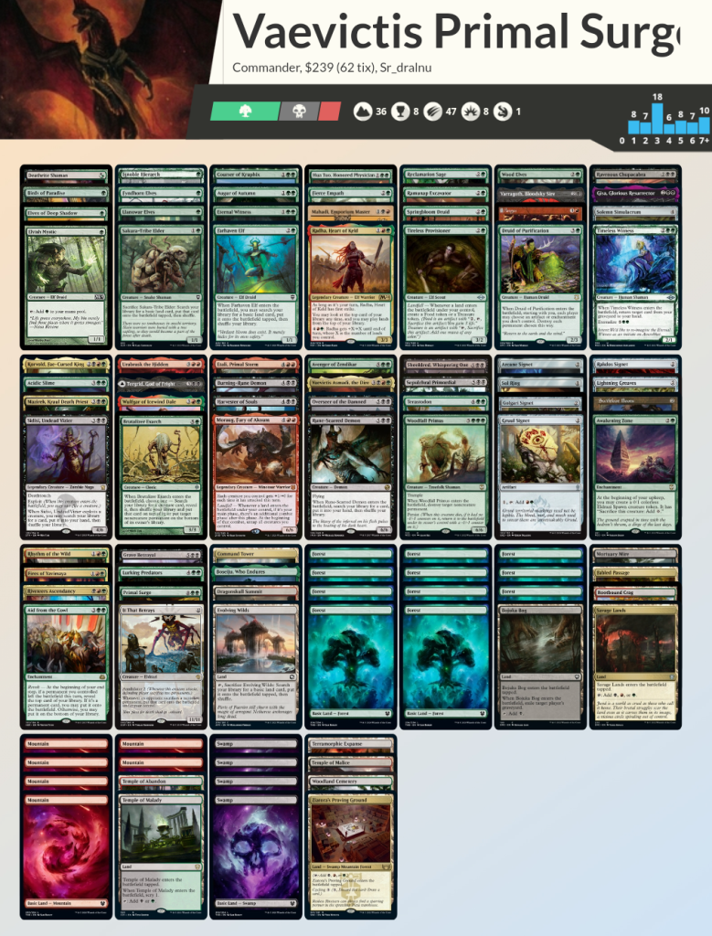 El mazo sobre todo busca rampear para jugar cuanto antes al comandante. Una vez en mesa, hagamos el combo del Primal Surge o no, es un avión que va a eliminar CUALQUIER COSA que nos moleste, por lo que, pese al azar de su habilidad, va a entorpecer mucho el juego de los rivales mientras avanza en el nuestro (buscar en la biblioteca por criaturas grandes o el combo).
