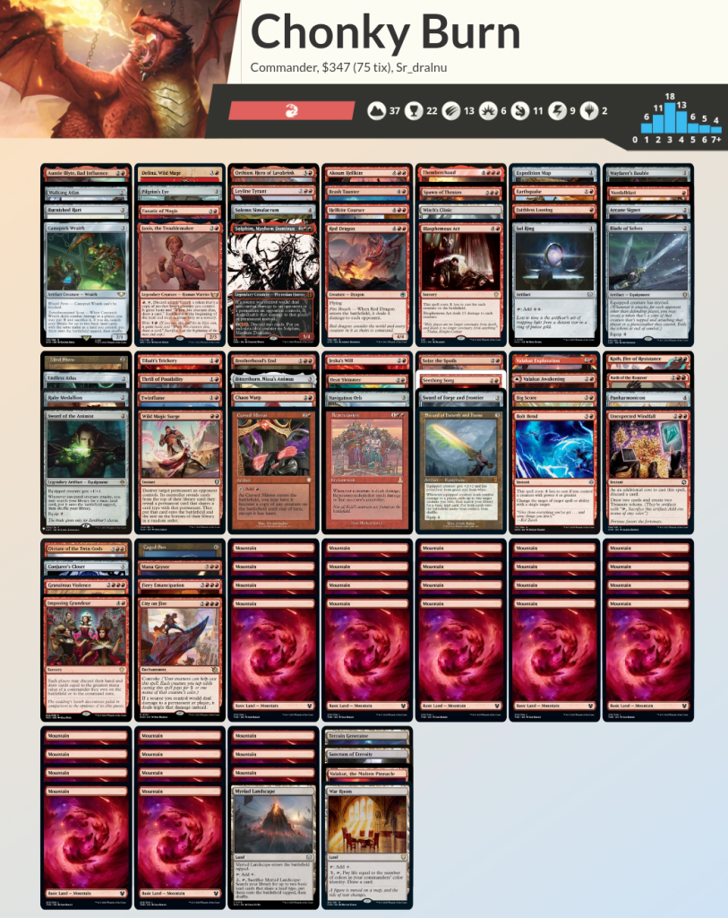 La idea del mazo es sencilla, jugar cuanto antes a nuestro comandante para hacer destrozos tanto en la mesa como en las vidas rivales (bueno, también nos afecta a nosotros mismos). Queremos ver el mundo arder y que la partida acabe cuanto antes. Nos da igual si morimos en el intento, lo que buscamos con este mazo es fuego y destrucción. Somos un dragón gordo y con muy mala leche.