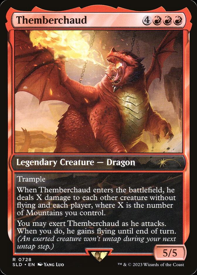 Y para que nuestro gordito haga más daños aún, podemos duplicarlo para que el token vuelva a disparar su habilidad de destrucción. Solo debemos asegurarnos de crear el token tras haber atacado con Themberchaud para darle la habilidad de volar y ser inmune al daño del token. Y si, las criaturas que crean tokens morirán al copiar al comandante y recibir el daño, pero morirán felices por la causa. Además, siempre se puede duplicar otras criaturas del mazo con buenos ETB como los que te buscan tierra.