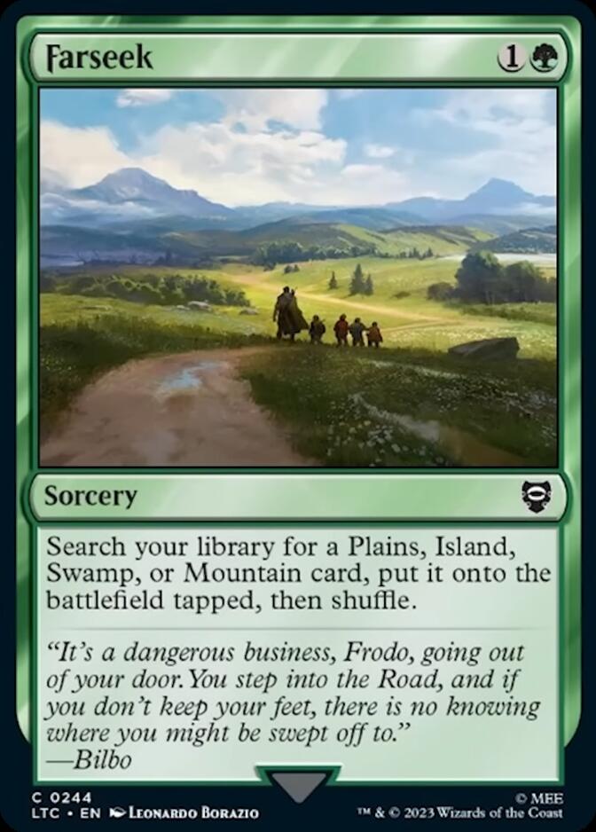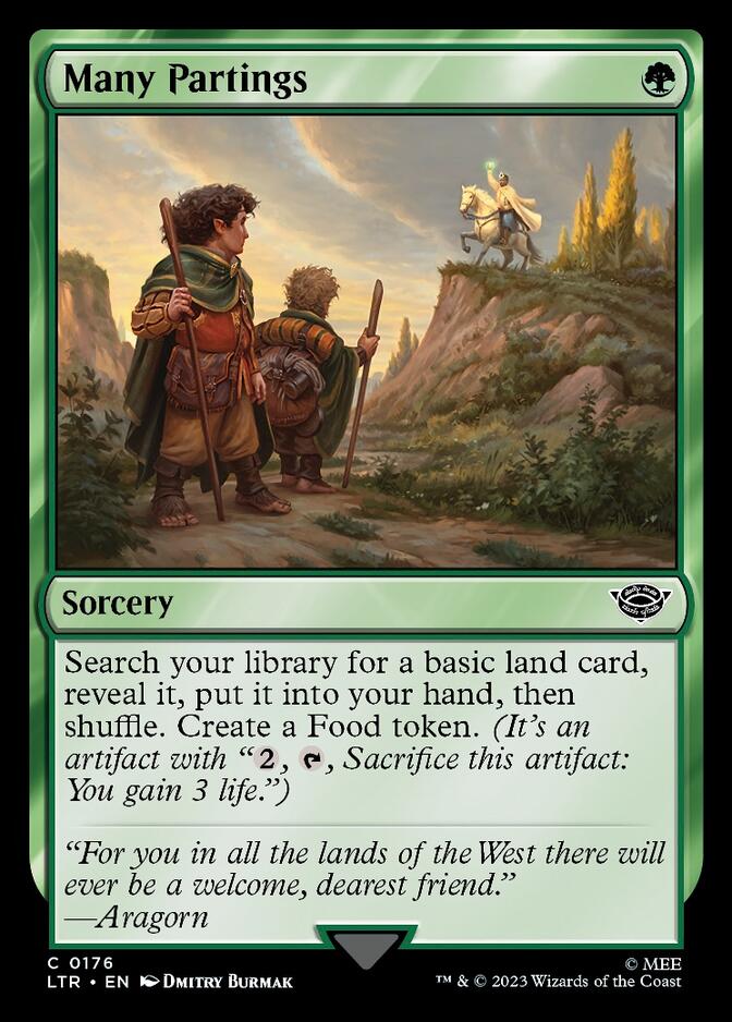 Primero vamos a empezar con el rampeo. Fijémonos primero en el que tiene sinergia con los Food Tokens. Many Partings solo cuesta 1 maná y nos buscará tierra a la mano y un Food en juego. Elanor, a parte de darnos Food ella misma, hará que cada turno busquemos una tierra, ya que la idea del mazo es sacrificar al menos un Food Token en cada uno de nuestros turnos. El Goose es un buen motor de generación de Food, a parte de sacrificarlos para dar maná de cualquier color.