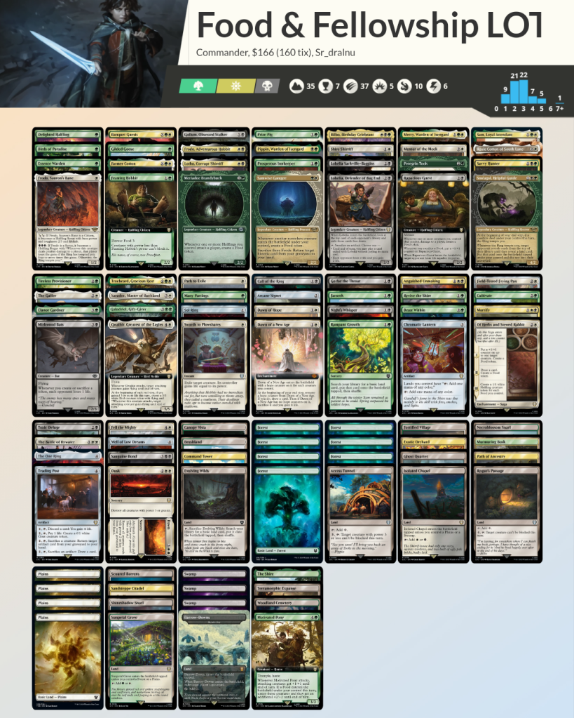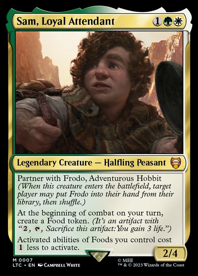 Frodo y Sam serán nuestros comandantes. Entre ellos son muy sinérgicos. Sam nos dará Food Tokens y serán más fáciles de sacrificar. Frodo aprovechará esas 3 vidas para activar el emblema del anillo y aprovechar sus beneficios, al mismo tiempo que nos hará robar cartas.