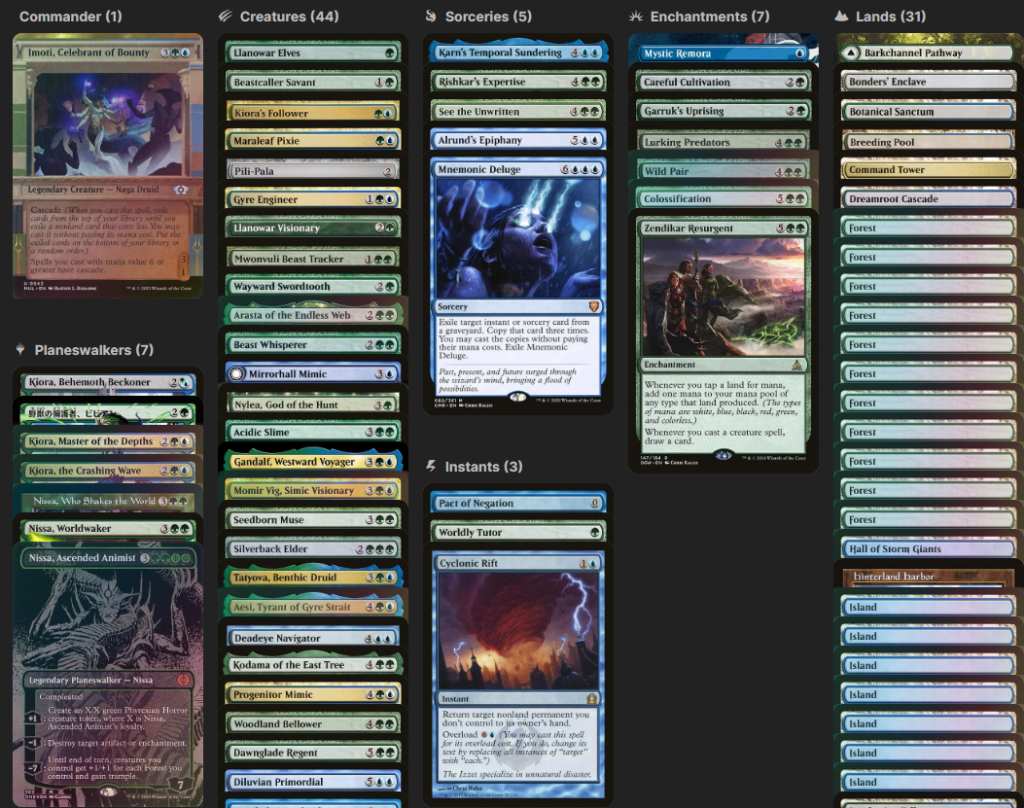 El mito se ha tornado en realidad y por fin he tenido algo de tiempo para subir el decktech de Imoti. Cabe destacar que es un mazo que suelo jugar en físico y suele cambiar constantemente en búsqueda de la cascada perfecta. Veréis que se desvía de un mazo balanceado pues en este mazo hay muy pocos instantáneos o trucos bajo la manga. ¡Imoti es como el 2×1 de las pizzerías! ¡Incluso a veces es capaz de encadenar un 3×1 si te portas bien y el maná te deja ^^U