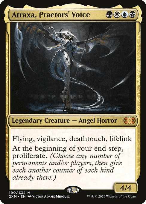 Volvamos al tema de las criaturas. Al igual que los artefactos, según el coste de maná, su apoyo será distinto y encarado a asegurar que tengamos los 5 colores disponibles y efectos añadidos si casteamos cosas legendarias. Por no decir que Atraxa (la vieja) es un staple (carta fija) en este mazo que necesita los contadores como agua de mayo.