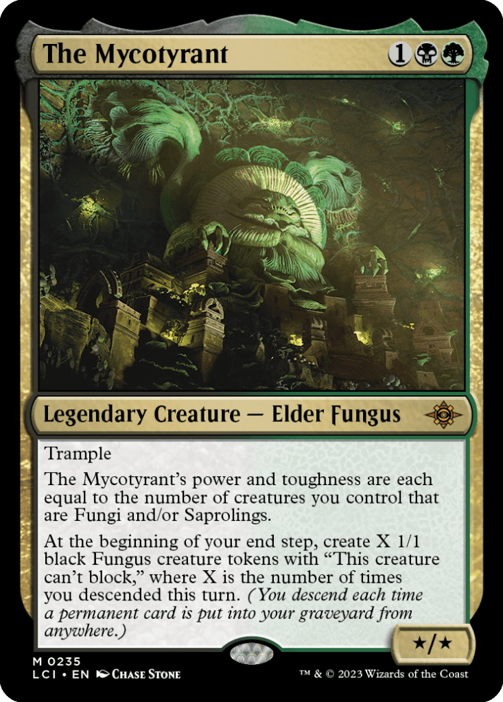 Con los saprolines ya me había ganado. Teniendo en cuenta lo rápido que se puede llenar la mesa de saprolines por otros medios, y de hongos con el Mycotyrant, va a ser un comandante muy grande y con arrollar, eso siempre es un peligro. Puedes darle un toque de criaturas y otros permanentes que se autosacrifiquen para obtener beneficios y aún así no perder presencia en mesa ya que generarías tokens. Parece un comandante bastante equilibrado entre el «Go Wide» de llenar la mesa de chinches y el «Voltron» de matar con daño de un comandante muy fuerte.