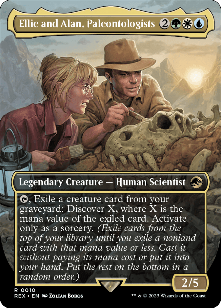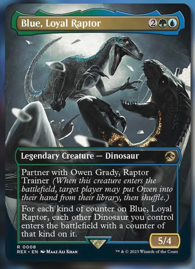 Una pareja de comandantes muy interesante, aunque solo sea por darle al tipal de dinosaurios una combinación de colores diferente. ¿Merecerá la pena perder el color blanco y añadir el azul? Seguramente no, ya que, salvo por los nuevos que puedan salir en el set, solo hay 6 dinosaurios azules que podrían entrar en esta identidad de color. Pero eso es irrelevante debido a la gran cantidad de dinosaurios en los otros colores y que el mazo va a depender de lo bien que gire en torno a los comandantes. Aunque Owen está limitado a activar su habilidad como conjuro, teniendo en cuenta lo grandes que son los dinosaurios, darle contadores que les den evasión (Arrollar y Menace) y, sobre todo, que tengan prisa para pegar nada más entrar en juego, es bastante útil. Por suerte no necesitamos colocar los contadores tan lentamente uno a uno a cada dinosaurio que jugamos, ahí entra en escena Blue para repartir los que ella tenga. ¡Pero ojo! Solo copia un contador de cada tipo, no sirve que le pongas cinco contadores +1/+1, ya que los dinosaurios que entren en juego solo obtendrían uno.