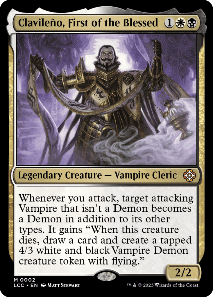 No es necesario que sea él quien ataque, así que lo puedes mantener a salvo mientras mandas a tus hordas de vampiros demonios a morir en el ataque y recuperar carta en mano y criatura (por lo general, más grande) en juego. Lo bueno es que, pese a lo agresiva de su habilidad, también puedes matar a tus vampiros sacrificándolos para otras causas. Una estrategia «Aristocrats» (sacrificar tus criaturas) con un poco de generar tokens de vampiros 1/1 le viene genial a este comandante.