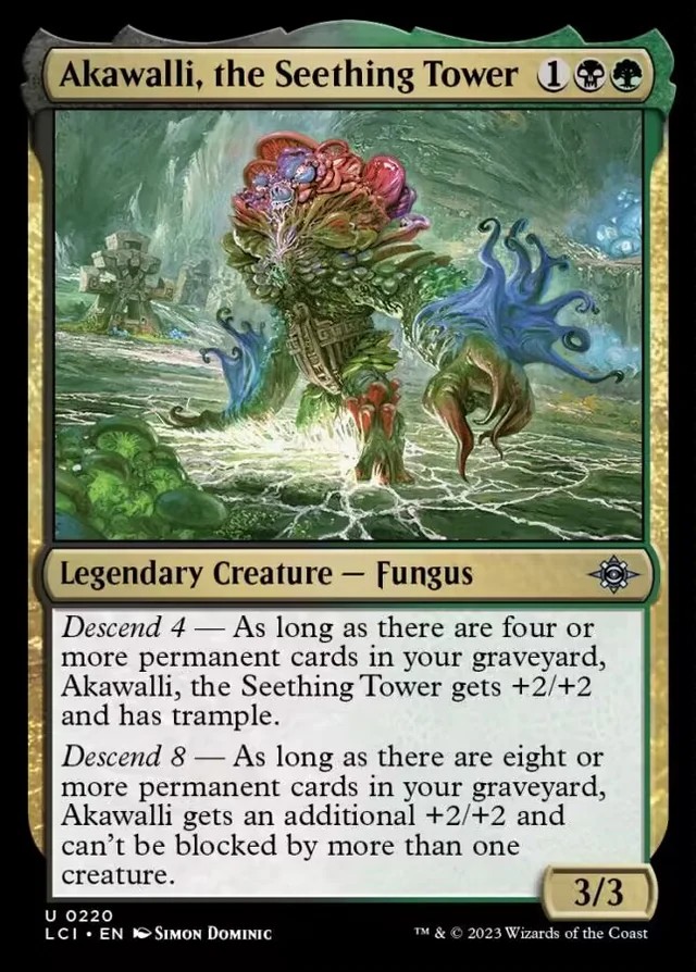Típico comandante Voltron que busca matar con daño directo de nuestro general. La verdad es que tiene muy buenos números. La mayoría de las veces entrará en juego siendo un 5/5 que arrolla y casi seguro que siempre va a acabar siendo un 7/7 que arrolla y solo la puede bloquear una criatura. Simplemente hay que llenar el mazo con cartas autosacrificables en plan «sacrifica y busca una tierra básica» o cosas así, para asegurarnos de tener rápido el «Descend». Y es un fungus, eso siempre suma puntos.