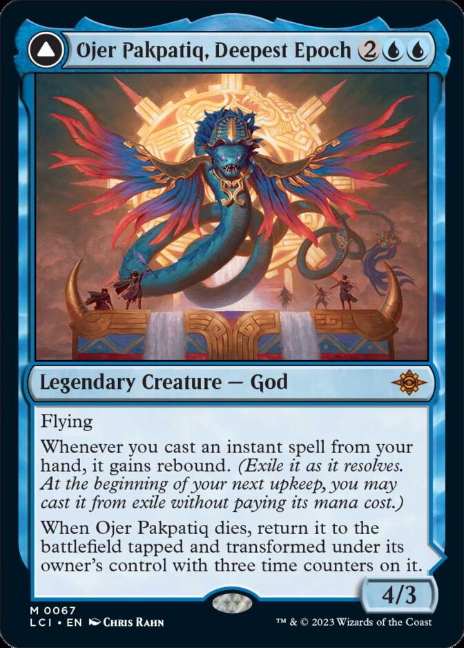 La verdad es que el Dios azul es bastante directo. Quiere un mazo spellslinger que se preocupe de lanzar muchos instantáneos, los cuales los rejugarás gratis en tu siguiente turno. También puedes hacerle un mazo con sinergias con jugar cartas desde el exilio, ya que desde ahí juegas los instantáneos con rebound. La mayor pega que le veo es que tiene defensa 3, y sabe a poco. Al menos es bastante fácil volver a transformarlo en criatura (2 turnos).