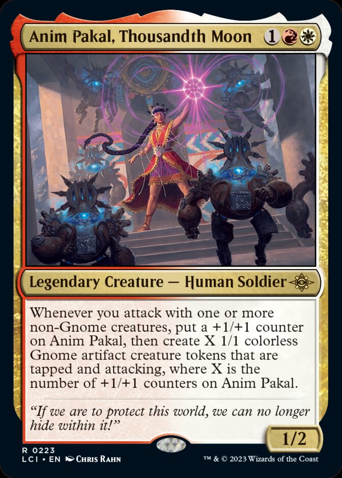 Lo siento, este no es el comandante tipal de gnomos que estabas buscando. Más bien quiere criaturas no gnomos para poder disparar su habilidad. Lo bueno es que la estrategia de tokens ya ha probado que funciona en estos colores, así que un comandante que crece y pone tokens está muy bien. Luego hay que fijarse en meter efectos que pongan contadores +1/+1 para acelerar al comandante a la hora de llenar la mesa, por suerte hay muchas auras y equipos que pueden ayudar. Y ya que tanto gnomo artefacto tendremos, también se le puede poner alguna sinergia con criaturas artefacto.