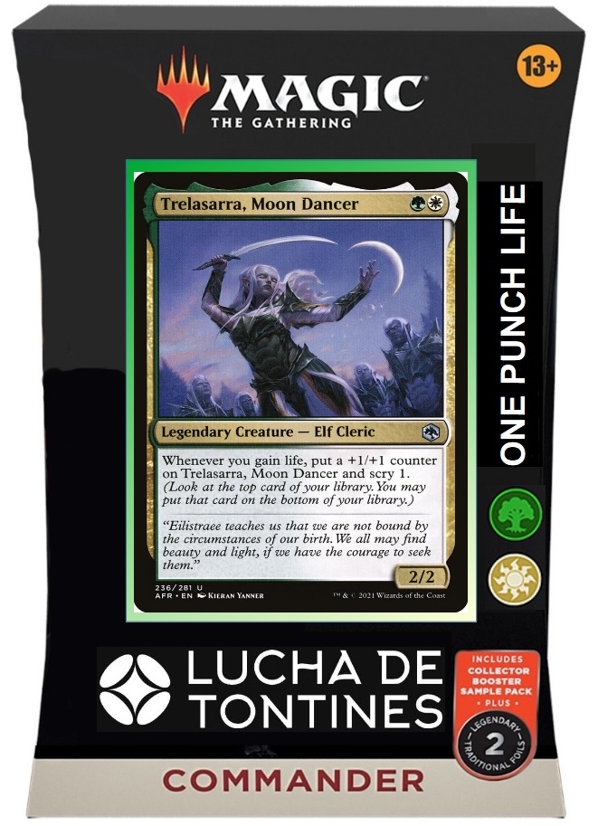 Trelasarra, Moon Dancer es un 2/2 por un bosque y una llanura que siempre que ganes vidas le pones un contador +1/+1 y adivinas 1 carta.