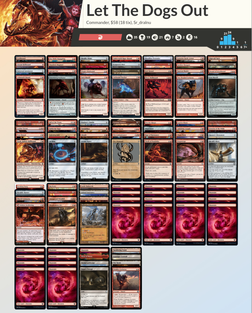 Es un mazo sencillo que, ya que no tiene mucha defensa, intenta ir con todo en el ataque intentando aprovechar las ventajas del comandante. Y si encima se le da el toque de ser un mazo tipal de perros… ¡Pues más carismático!