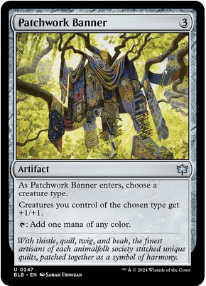 Dentro de los artefactos, como siempre tenemos staples como sol ring, arcane signet y sospechosos habituales. Sin embargo, Bloomborrow ha traído a los typales un nuevo banner con el Patchwork Bannergratis. Aparte del maná, genera un potente +1/+1 a los ratones.