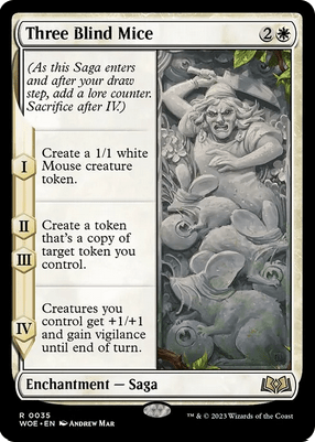En los encantamientos pasamos por el Blacksmith’s Talent que nos regala un artefacto, un equipar gratis por turno y a aquellos equipados un dañar dos veces y prisa que pueden decidir muchas cosas. La Shared Animosity puede ser un finisher demoledor y la saga de los tres ratones ciegos nos deja copiar alguno de los tokens de offspring, aparte de por supuesto los que genera la propia saga.