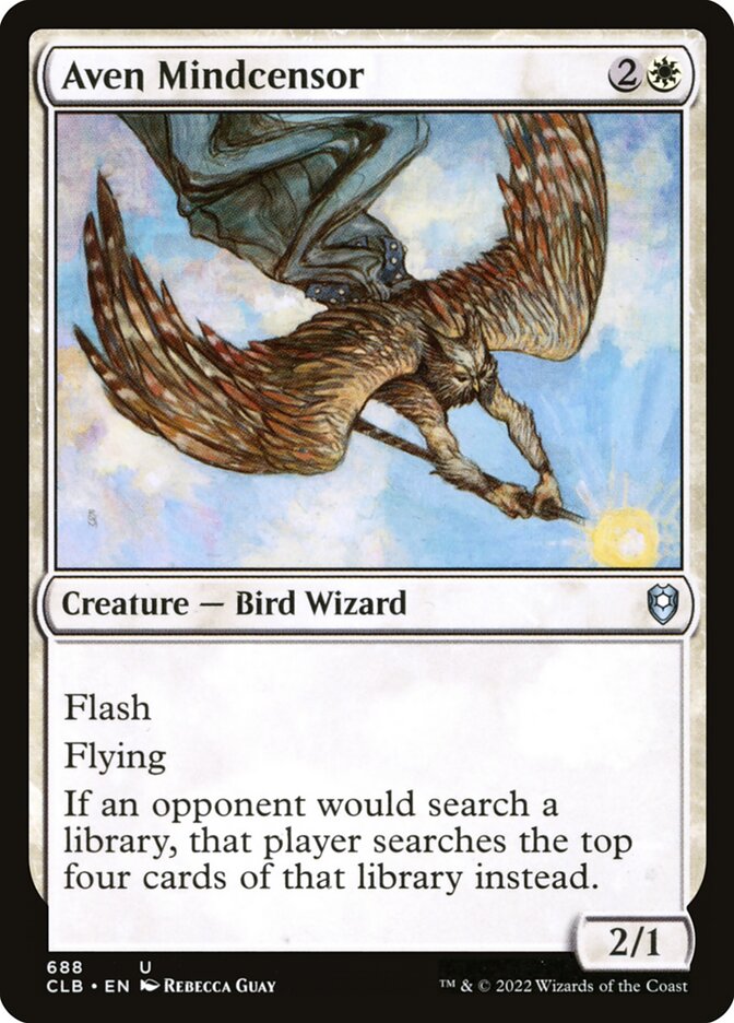 En Aven Mindcensor, ah, tan socorrido en mazos de control, la cara de placer que se queda cuando dices a la vez que lo lanzas un «en las cuatro primeras» no tiene precio. Mientras tu oponente te maldice por lo bajo.