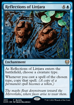 Pero no del todo pues falta la tercera pieza para que las cartas que «no pintan nada» tengan sentido. Los reflejos de Littjara es la última pieza de un combo «sencillo» Yo lo uso en mi mazo de Inalla (sin usar el encantamiento) y me parece un combo útil ante los «atascos» en partidas largas. No asegura la victoria (curiosamente) pero te dá turnos extra con tan solo poner una copia de la pirata. A excepción de la premura que tiene con Inalla (dado que pongo el token de la pirata pagando un maná extra y que entra con prisa) tendremos que aguantar un turno «de tapadillo» puesto que no podemos girarla inmediatamente (a menos que se equipe con grebas, claro) y se tiene que cumplir la bendición de la ciudad. Esto es, controlar 10 o más permanentes y se obtiene hasta el resto de la partida, por lo que, la suma más facil es, teniendo el encantamiento (nombrando hechiceros) , grebas relámpago y la tierra ya en juego, es 8 mánas en total (4 que son islas)Además, con la habilidad de la tierra subirás siempre la pirata «original» y ya tendrías un turno extra despues de este.