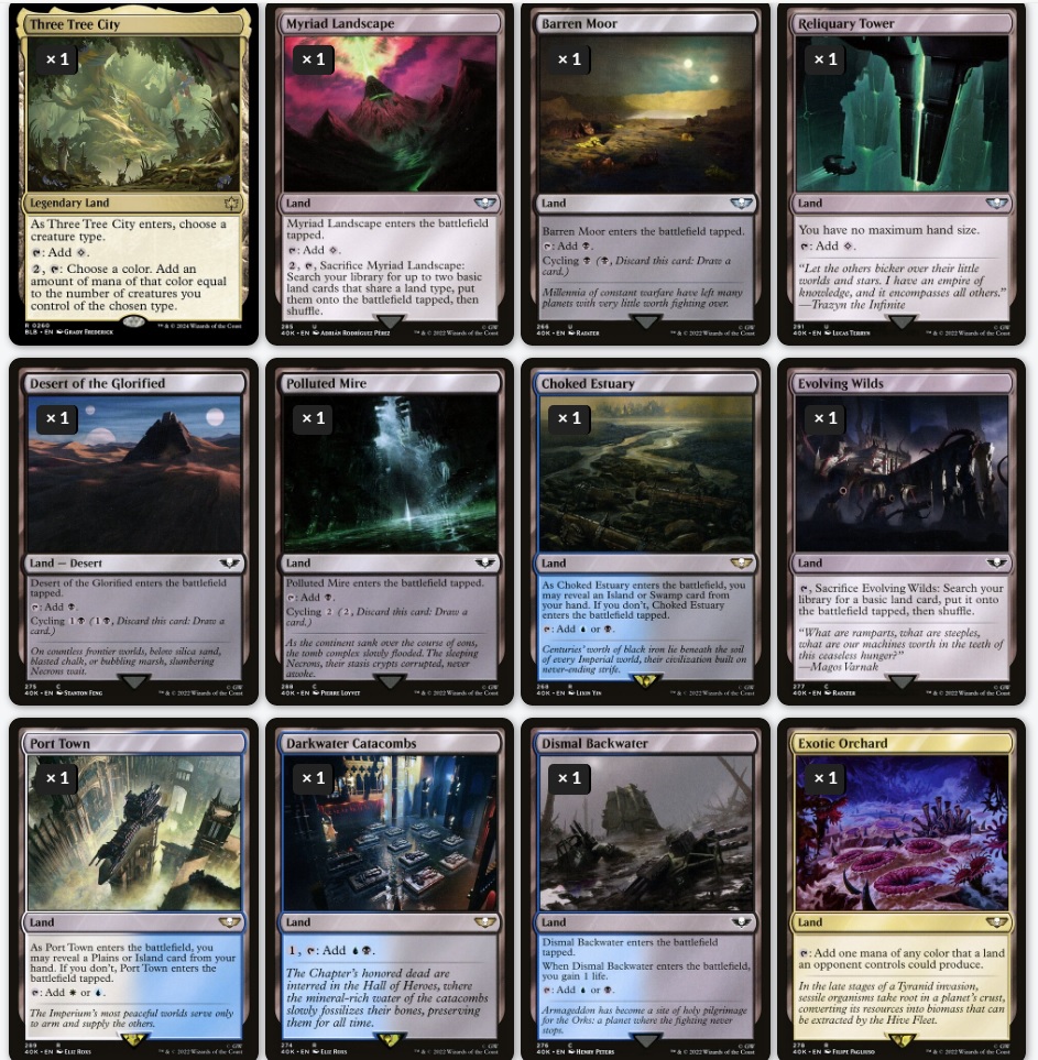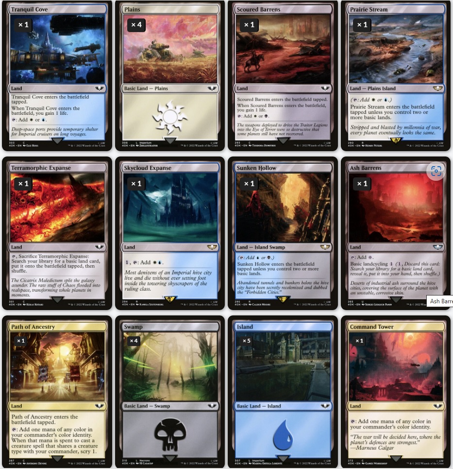 Tierras usaremos todas las de 40k y meteremos al árbol de Bloomburrow para aprovechar que todo es astartes para sacar una ventaja en mana.