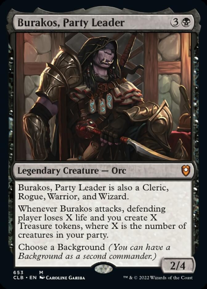 Empecemos por las criaturas «comodín»: los que cuentan como cualquier criatura del Party. Outcast tiene coste bajo y es imbloqueable, es un buen coste 1 para ayudar al Party. Mirror Entity es un finisher en un mazo con tantas criaturas. Y Burakos es un gran motor de tesoros para rampear.