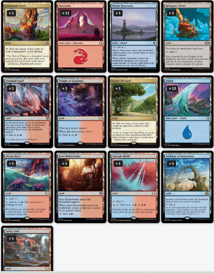 Efectos diversos. Aqui hablare de estos que no teinen hogar pero bueno. El betrayal imaginad el potencial con ese coste 0. El command para revisitar las atracciones. Con suerte y efectos de tirar mas dados, puedes hacer un bucle de muchas visitas. La iteration por scry/robo sin serlo. EL prismari por ser modal y muchas cosas poder hacerlas. El stolen goods me encanta en este deck por las pirulas que puedes hacer. Mana geysar por ramp. Replication technique por la cantidad de pirulas que puedes llegar a hacer igual que con la artesania de saheeli.