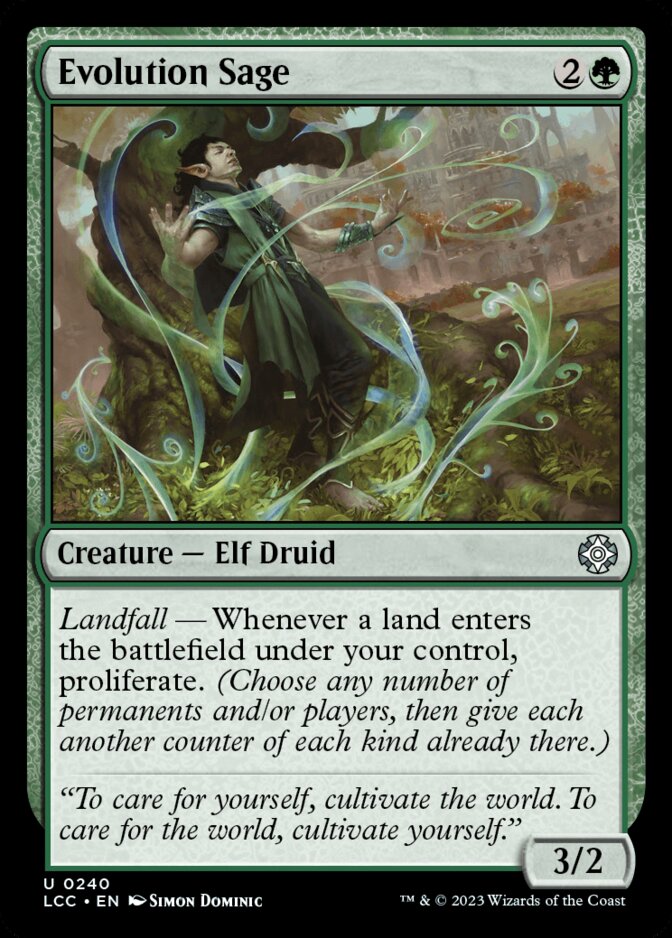 Tiene coste 5, pero entre el contador que le pones al entrar y el que le pones al atacar en el siguiente turno, ya es un 5/5 que si daña te dará carta. Aunque lo ideal es repartir los contadores +1/+1 entre varias criaturas para aumentar las posibilidades de robo. Tened en cuenta que, como está redactada la habilidad, solo hará robar un máximo de 3 cartas (una por cada oponente dañado, sin importar cuantas criaturas lo golpearon). Como siempre en estos colores y en este tema de contadores, quiere una estrategia Go Wide de llenar la mesa con criaturas pequeñas e ir haciéndolas crecer a base de contadores. No es nada nuevo, mucho dobla-contadores y creación de tokens 1/1, lo típico.